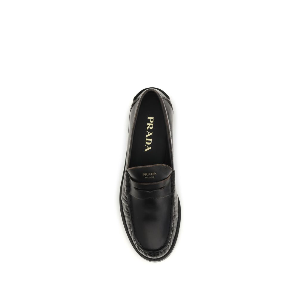 The leather Loafers by Prada are made of vintage-effect leather and stand out for their elegant and timeless design, embellished by the laminated logo printed on the instep. The round toe and classic mask give the model a refined and versatile aesthetic, while the logo printed on the inside recalls the brand’s unmistakable identity.