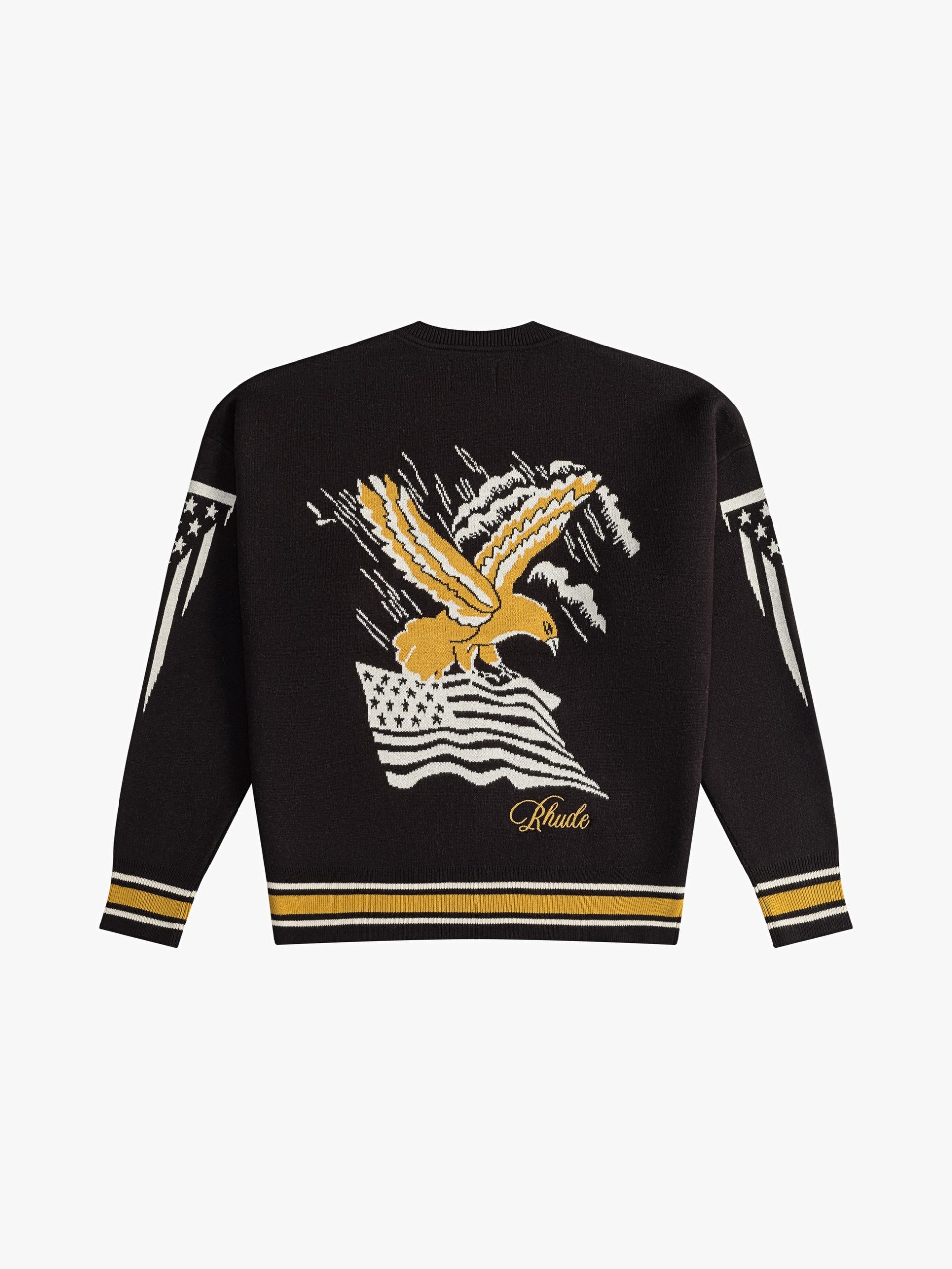 Dare to stand out with RHUDE’s masterfully crafted Eagle Souvenir Knit Crewneck. A blend of opulence and street chic, this sweater is a symphony of Italian finesse, spun from 70% plush wool and 30% luxurious cashmere. Featuring an iconic black and gold colorway that commands attention, it’s an emblem of fashion-forward sophistication. Perfect for those unapologetically bold in style and spirit.