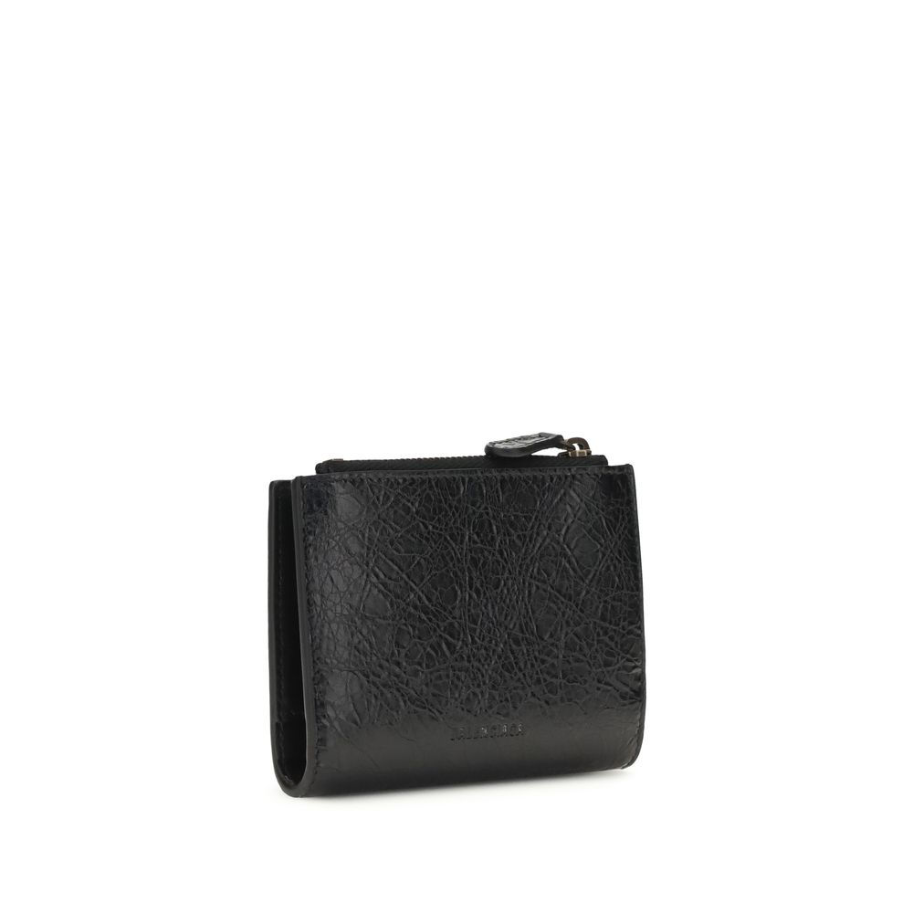 The Le City bi-fold Wallet by Balenciaga, crafted from Arena lambskin leather, combines elegance and functionality in a refined design. Featuring a tone-on-tone embossed logo on the back and brass hardware, it has a front zippered pocket, a zippered coin pocket, a snap closure, six internal card slots, an internal bill compartment, and four receipt pockets, offering organization and distinctive style in a luxury accessory.