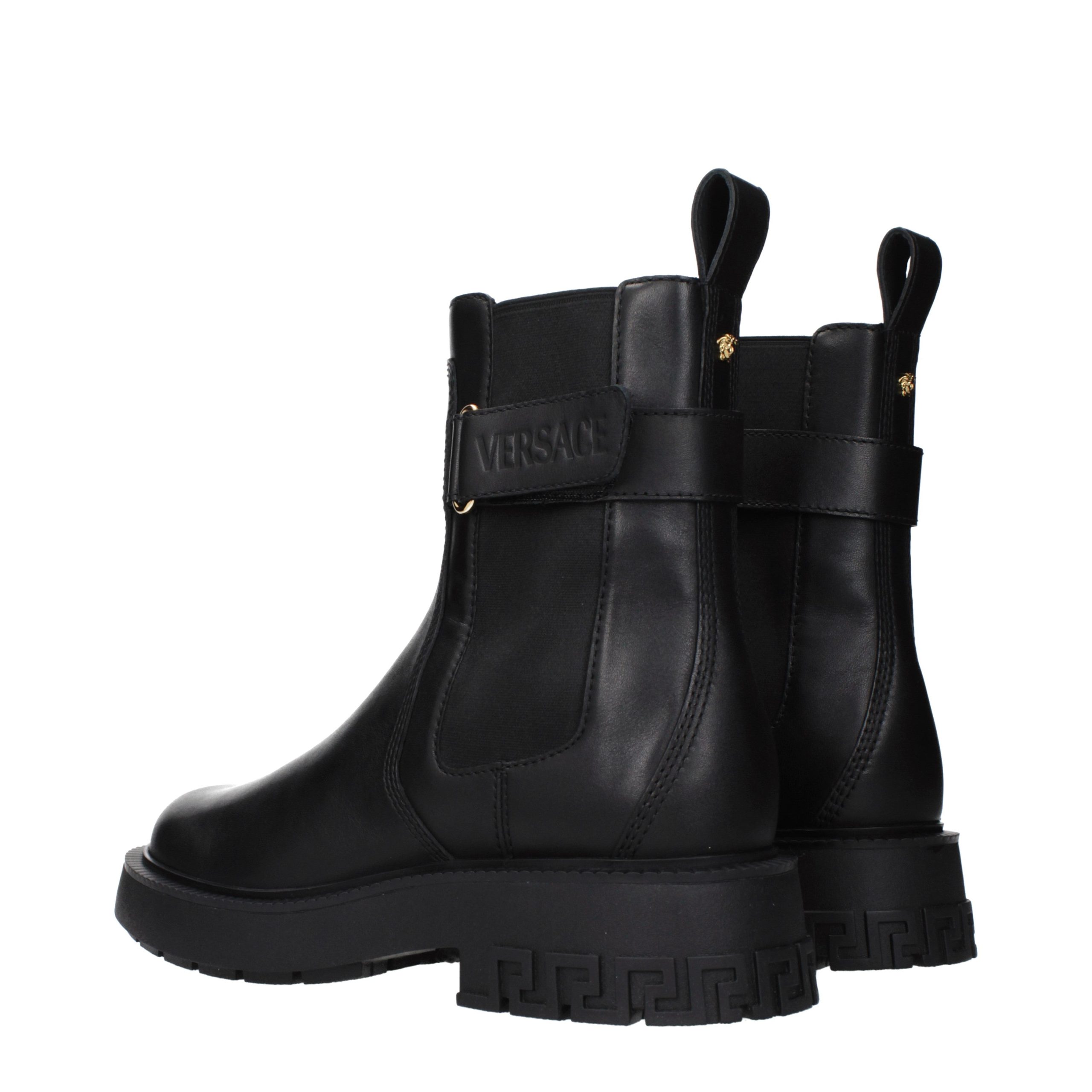 The product with MPN 10178721A127551B00V and code F86277 leather in black is a ankle boots designed by Versace. It has features like front logo, side logo, back detail.