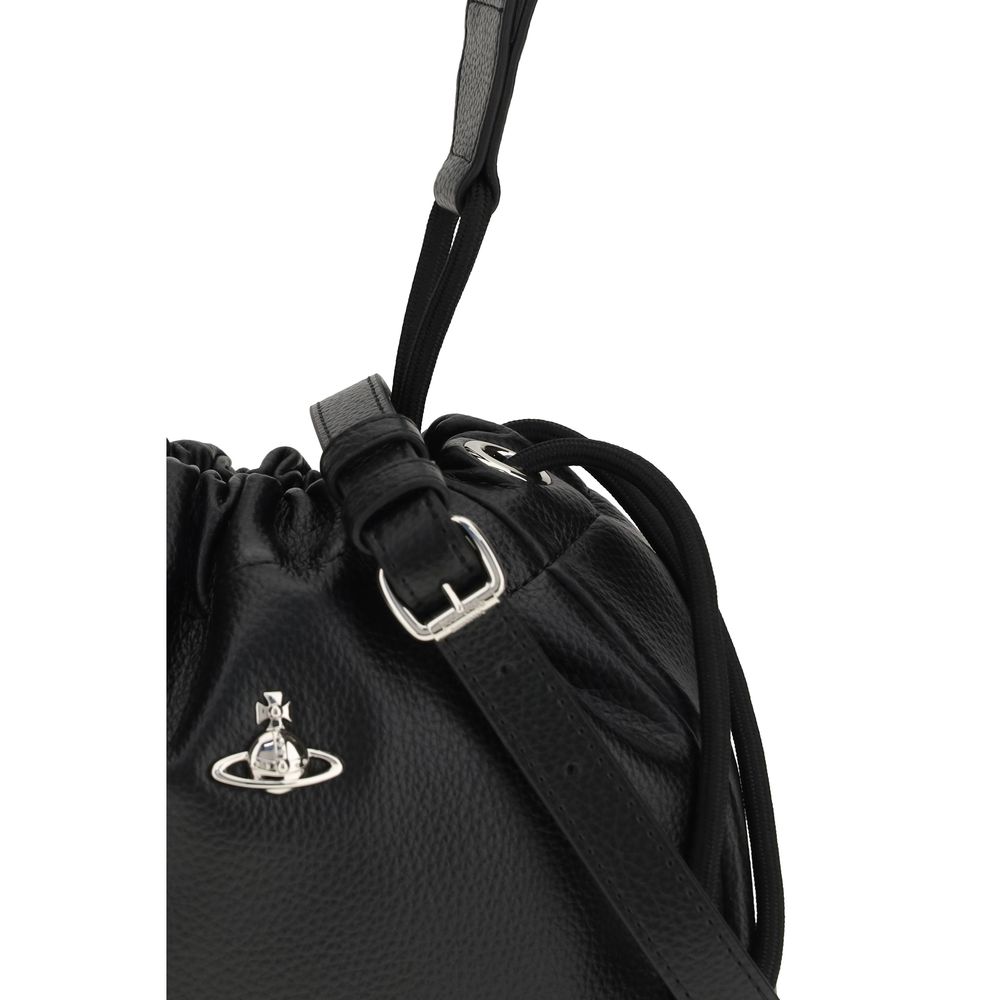 The Hilary Bucket Bag by Vivienne Westwood, crafted from grained synthetic leather, combines functionality and style in a distinctive design. The metal Orb logo embellishes the front, while the drawstring closure ensures practicality. Featuring a flat handle and removable, adjustable shoulder strap, the fabric-lined interior with logo offers organization and sophistication for all your essentials.
