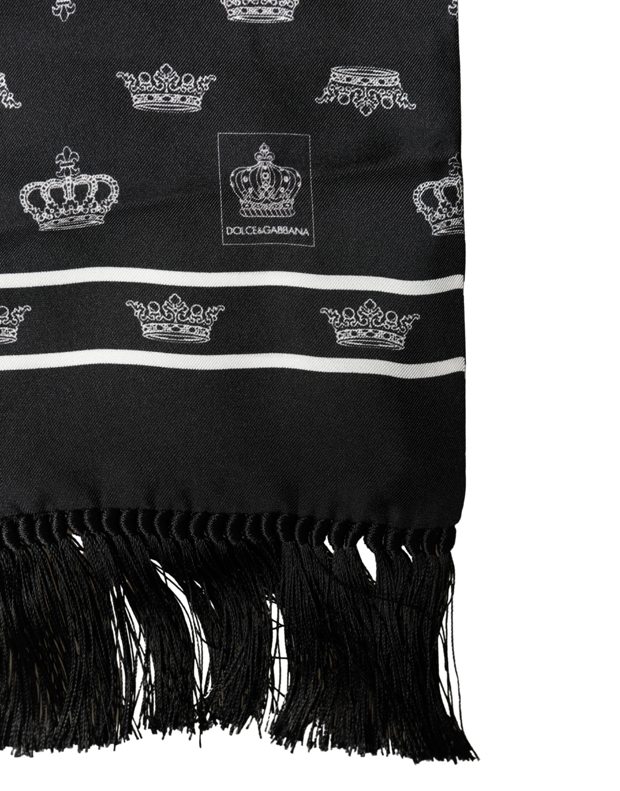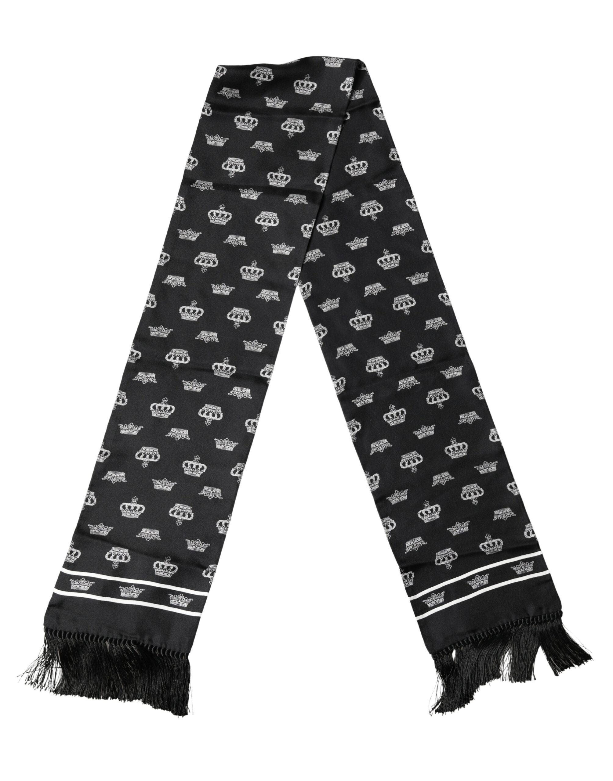 Gorgeous brand new with tags, 100% Authentic Dolce & Gabbana scarf. This elegant black silk stole features an all-over crown motif, a signature design element of the brand that reflects timeless luxury and refined Italian style. Crafted from smooth, lightweight silk, it is finished with classic fringed edges for a sophisticated and versatile look.