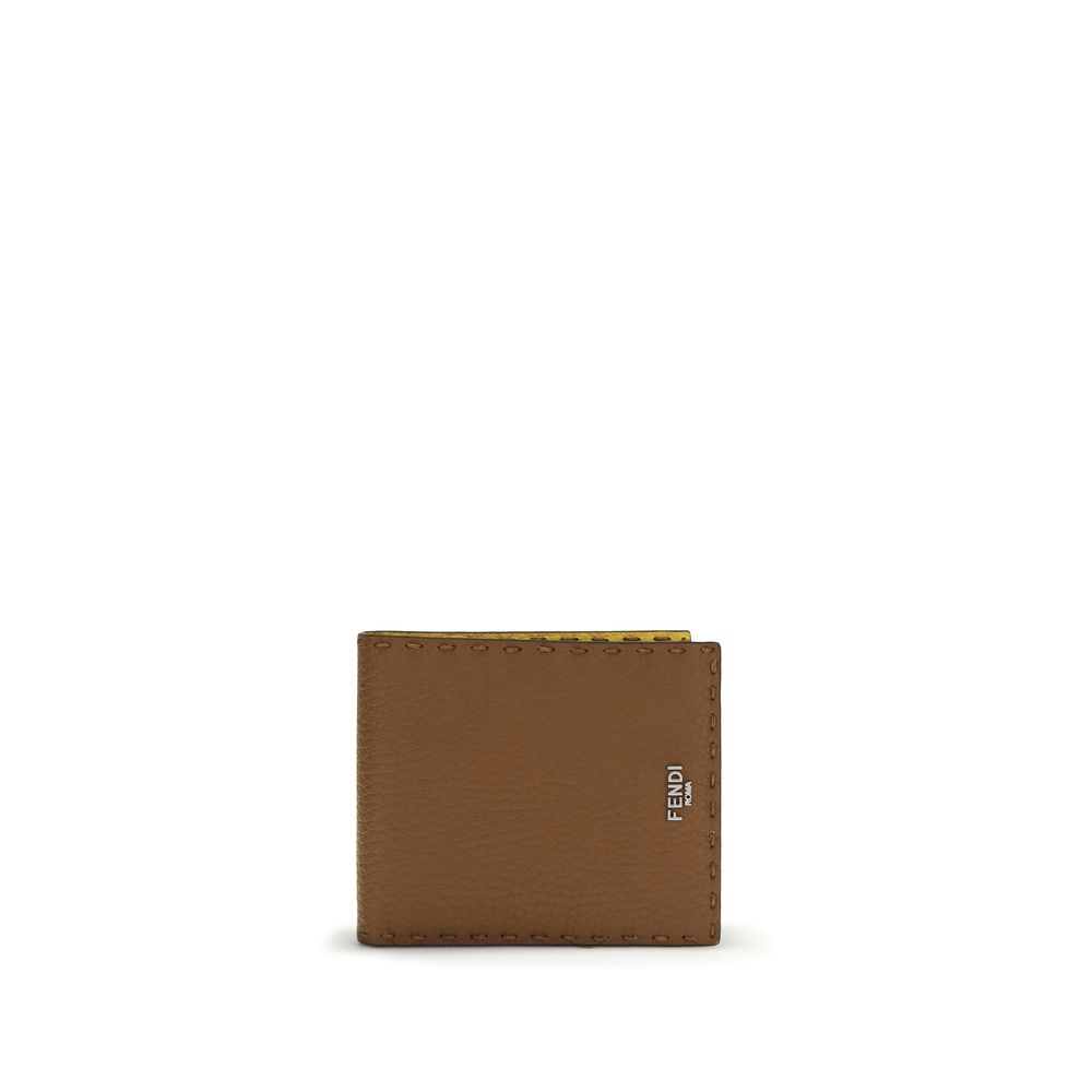 The Selleria Wallet by Fendi is crafted from cuoio romano leather with hand-stitched macro stitching, a symbol of the iconic Selleria craftsmanship. The contrasting yellow leather interior is organized with 8 card slots and due compartments for banknotes, while the metal Fendi Roma logo with palladium finish completes the design, combining artisanal elegance and functionality.