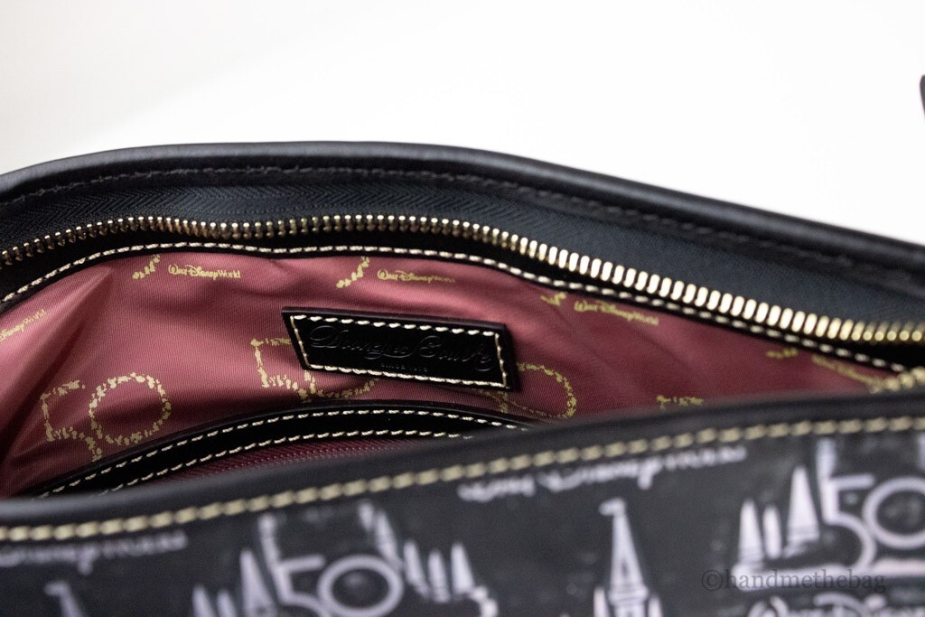 Experience the magic of Disney in an elegant and functional way with the Dooney & Bourke Black Walt Disney World 50th Anniversary Leather Tote Bag. This exquisite tote effortlessly combines style and practicality, making it the perfect accessory for any Disney fan. The luxurious, printed leather exterior showcases a charming Disney Castle pattern, while the eye-catching 50th Anniversary lining adds a special touch to this remarkable piece.
