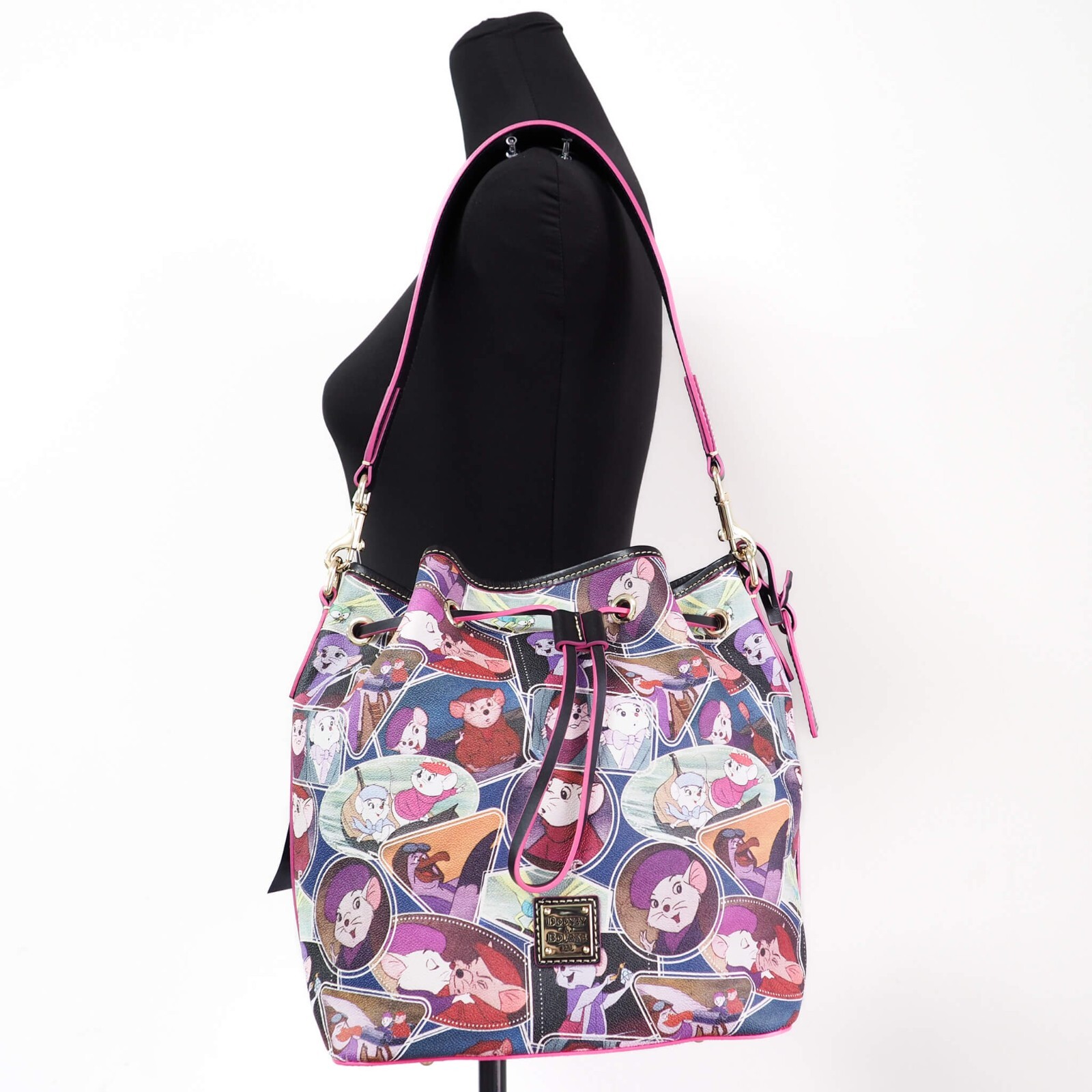 Elevate your accessory collection with the stunning Dooney & Bourke Disney Rescuers Drawstring Bucket Shoulder Bag. This exquisite handbag pays tribute to the beloved Disney characters with a vibrant multicolor design that is sure to turn heads. Crafted from high-quality coated canvas and leather, this bag boasts durability while maintaining a stylish appearance. With a spacious interior measuring 10″ W x 10″ H x 7″ D, it provides ample room for all your essentials, whether you’re headed to work, a casual outing, or a special event.