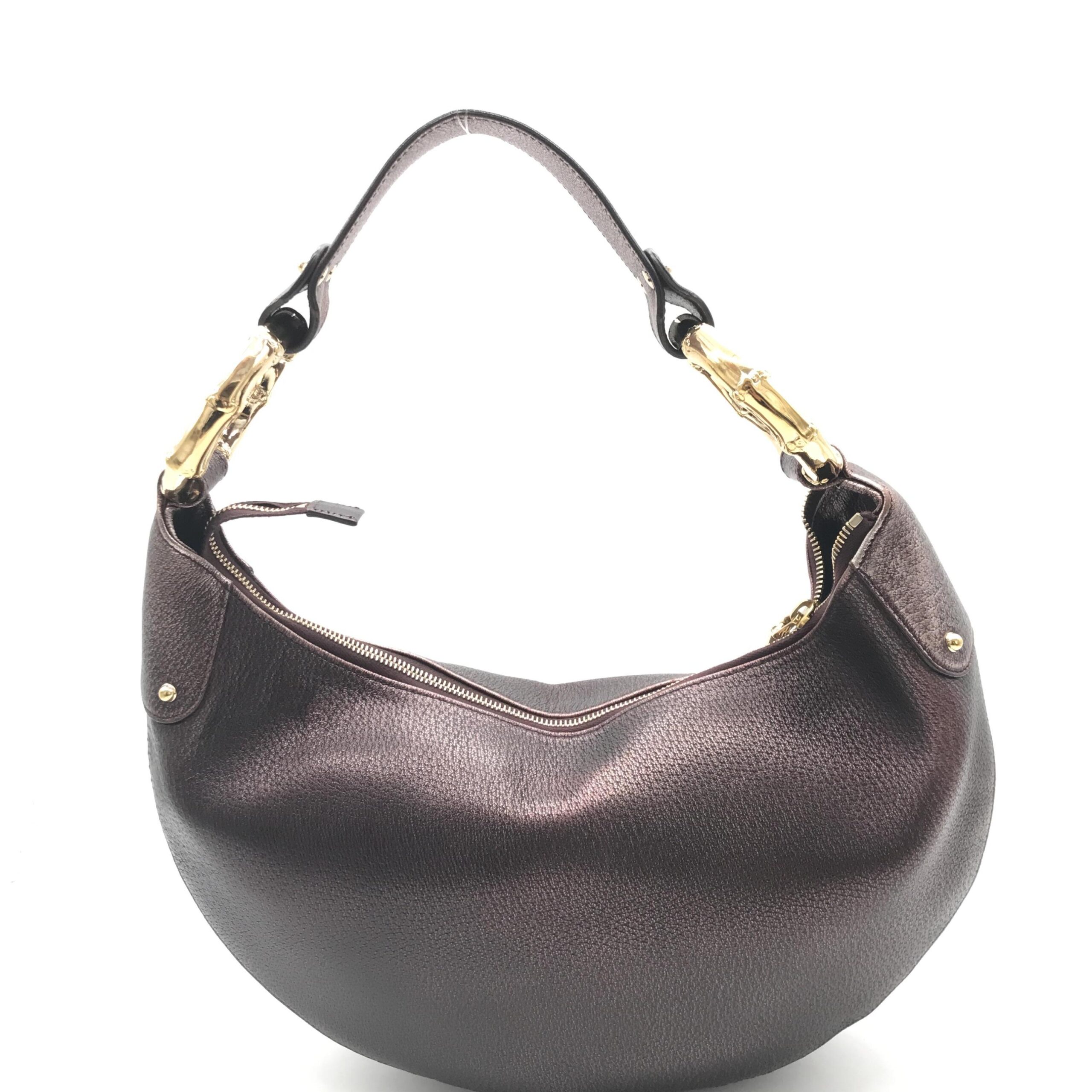 Whether you’re attending a chic soirée or simply elevating your everyday ensemble, the Gucci Metallic Leather Bamboo Ring Hobo Bag is a must-have addition to any discerning collection. Embrace the allure of Gucci and make this iconic piece yours today.