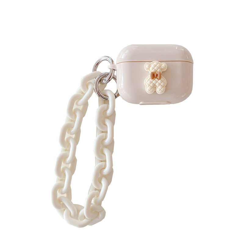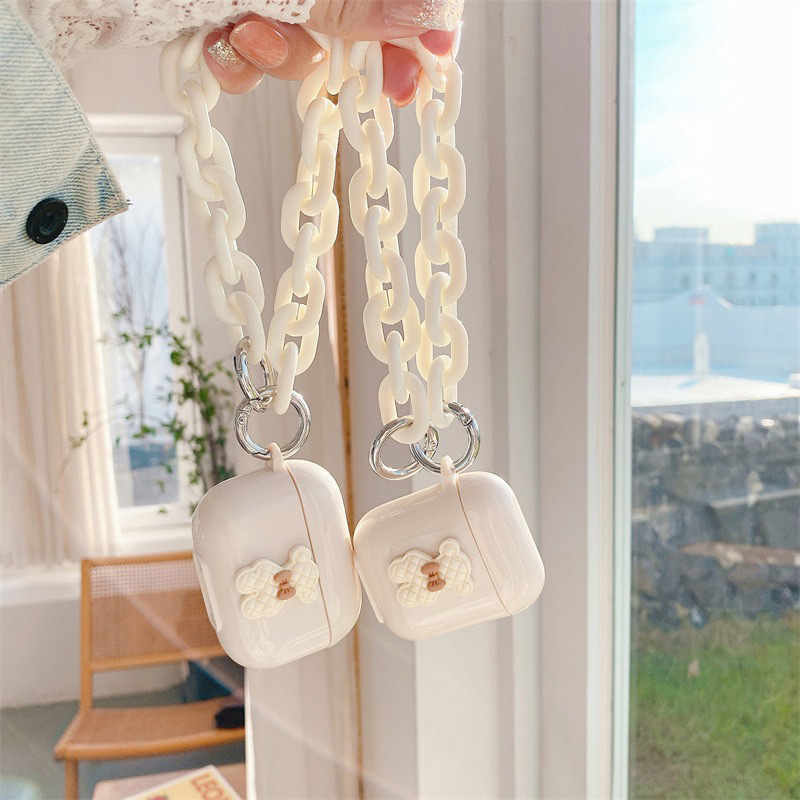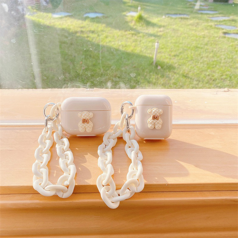 Color: Earphone Sleeves-Plaid Bear-Apricot Color-With White O Chain Strip