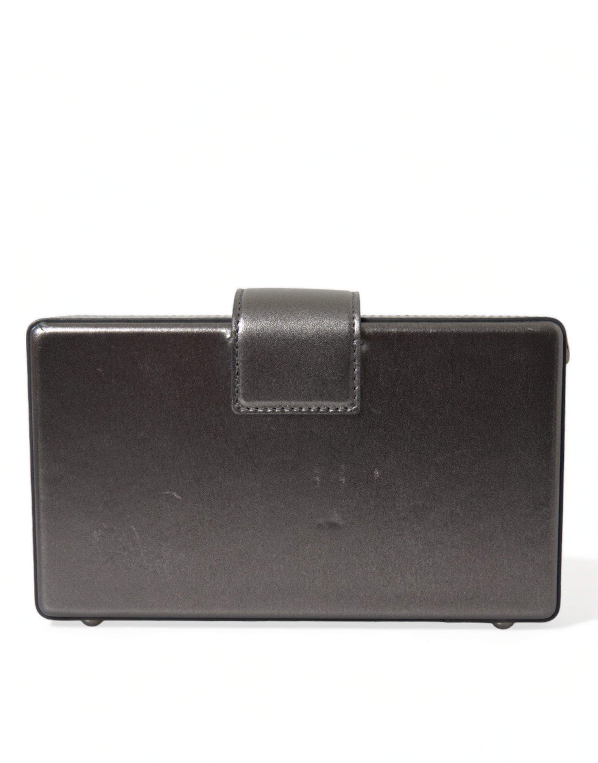 Gorgeous preowned, 100% Authentic Dolce & Gabbana shoulder bag in a striking steel gray tone. Crafted from premium leather, the structured box-style design is accented with polished gold-tone hardware and engraved logo push-lock closure for a refined touch.