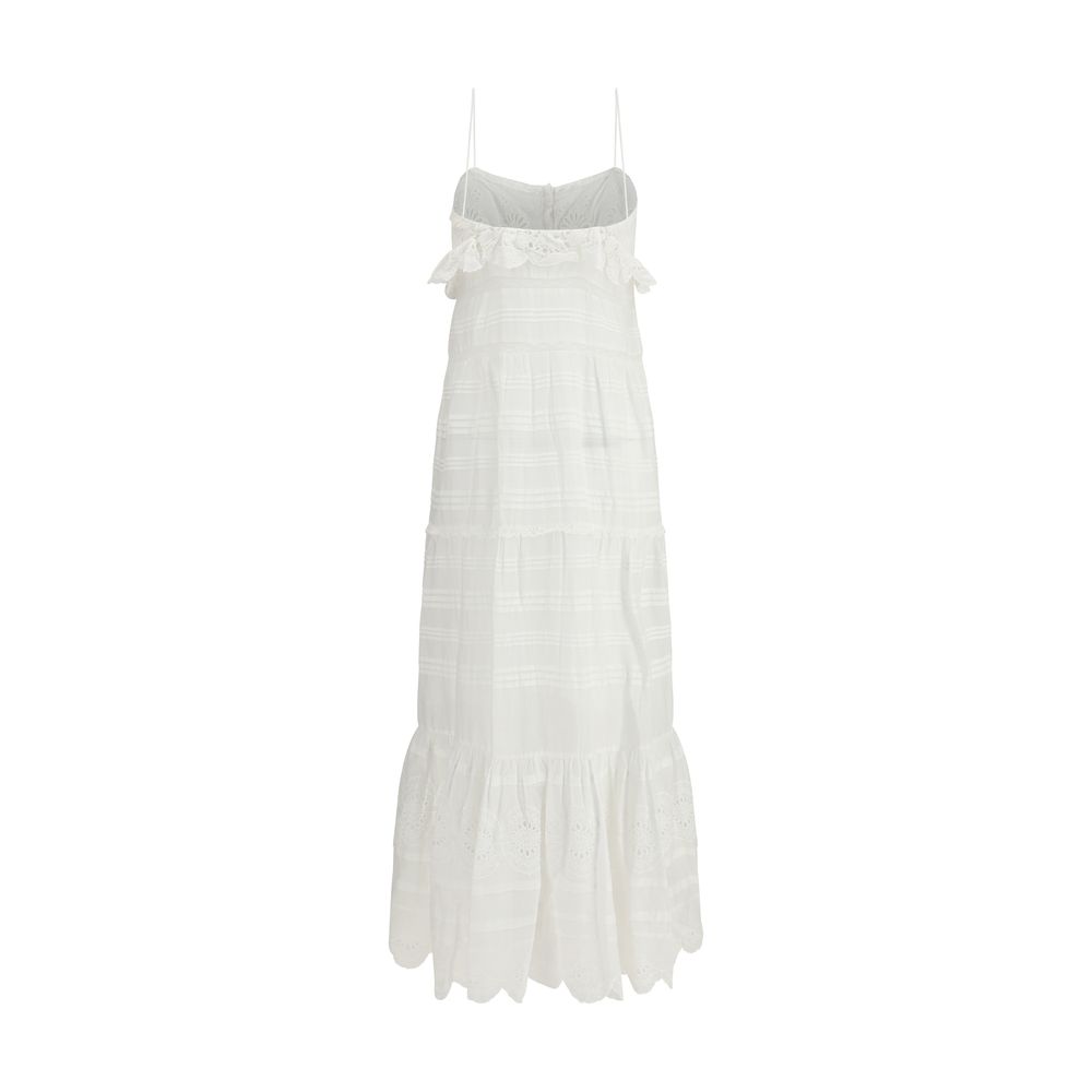 The Paule long ruffled Dress by Marant Étoile reflects the brand’s feminine and effortlessly romantic aesthetic. The design is defined by mesh details and delicate ruffle trims that add movement and lightness to the silhouette. The button fastening introduces a classic touch, while the tiered construction enhances the fluid shape of the dress, making it ideal for elegant yet relaxed styling.